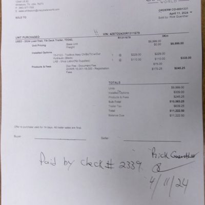 Load Trail, Tilt Deck Trailer, Floor Is 25’6″ Long, Floor Is 83″ Wide, Purchased New April 2024, Two 7,000 Lbs Axles, Trailer Brakes On Both Axles, Torsion Axles, Heavy Duty Wheels & Tires, With Spare, Tool Box On Front, Have Texas Title, (Purchased New For $10,583.25) This Is A Real Heavy Duty Tailer, Sell $4,900 940-206-2809 or 940-300-6703